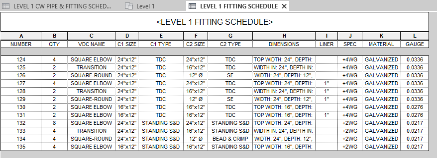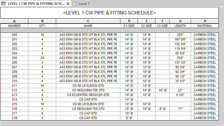 Above we have a chilled water pipe schedule for Level 1, straights first, fittings second, sorted by size and length. When these Items are broken up into spool sheets, our item number tags and bill of materials are likewise sorted in the same meaningful way, with zero additional effort.