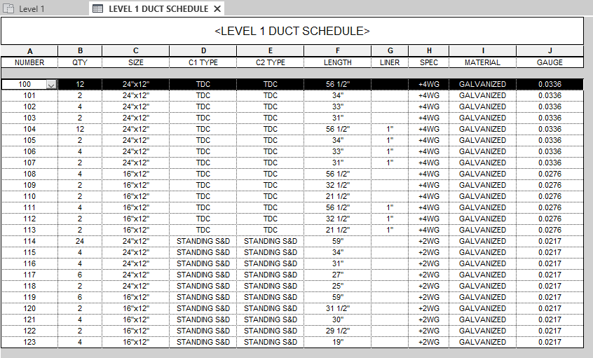 Above we have fabrication duct and fitting schedules created in Revit using VM Parameters and sorted by item number. When we specify a sorting priority for our items, our schedules, spools, packages, modules, logistics and MAJ files become streamlined, intuitive, efficient and lean. In the above examples, all of our our 22 gauge unlined coil joints are scheduled first, followed by our 22 gauge unlined machine cut joints. Moving further down the list we have our lined 22 gauge in the same order, followed by 24 and 26 gauge.